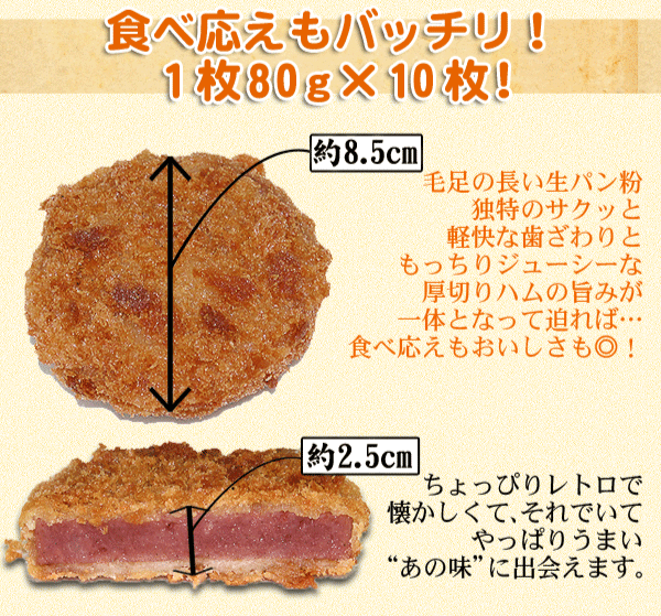 ハムカツ 厚切り(80g×10枚) お弁当ハムカツ 厚切り(80g×10枚) はお弁当に最適! ※ 上記内容に沖縄県・北海道の送料は含まれておりません※ 沖縄県500円、北海道1000円の送料が別途必要です お子様 にもおすすめ♪