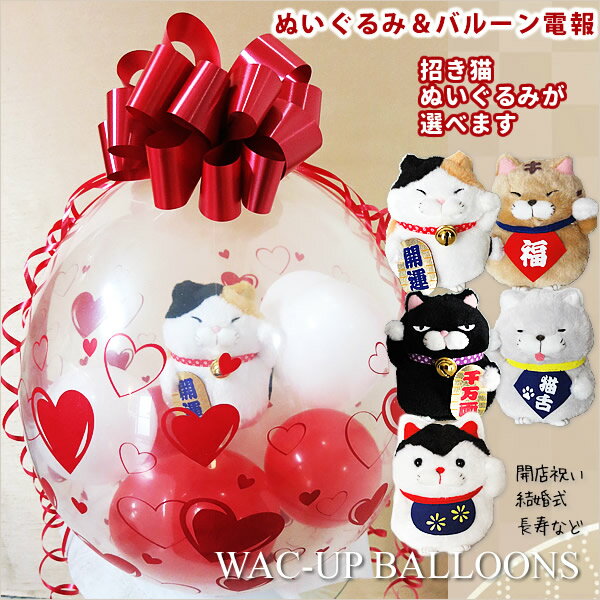 招き猫 結婚式 バルーン電報 猫好き プレゼント 誕生日 贈り物 ぬいぐるみバルーンラッピング:ひげまんじゅう招き猫(赤ハート)